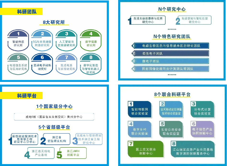 研究院坚持“科创兴院”战略,瞄准重大科学问题与“卡脖子”关键技术,加强原创性引领性科技攻关,加快高能级科创平台建设。已建成2个国家级中心:国家级博士后科研工作站、成电E创(国家备案众创空间)衢州中心;5个省部级平台:浙江省工程研究中心、浙江省新型研发机构、浙江省JMRH创新中心、浙江省无线电产业基地、新型微波探测技术教育部工程研究中心衢州中心。依托这些高能级平台积极开展高水平科创,申请发明专利160余项,获得软件著作权40项,依托研究院发表高水平论文200余篇,25个项目获得国家自然科学基金资助;签订横向项目45项,一项科技成果经浙江省科技厅推荐入围第二十四届中国高交会。已搭建智能感知(雷达、物联网)、激光测量等科研实验平台,建设物联网交互平台、数据中心设备一体化承载平台;正在建设微波毫米波电磁辐射测试平台、智能光电感知实验室、电磁生物医学影像科研平台作为科研设施与仪器开放共享平台。