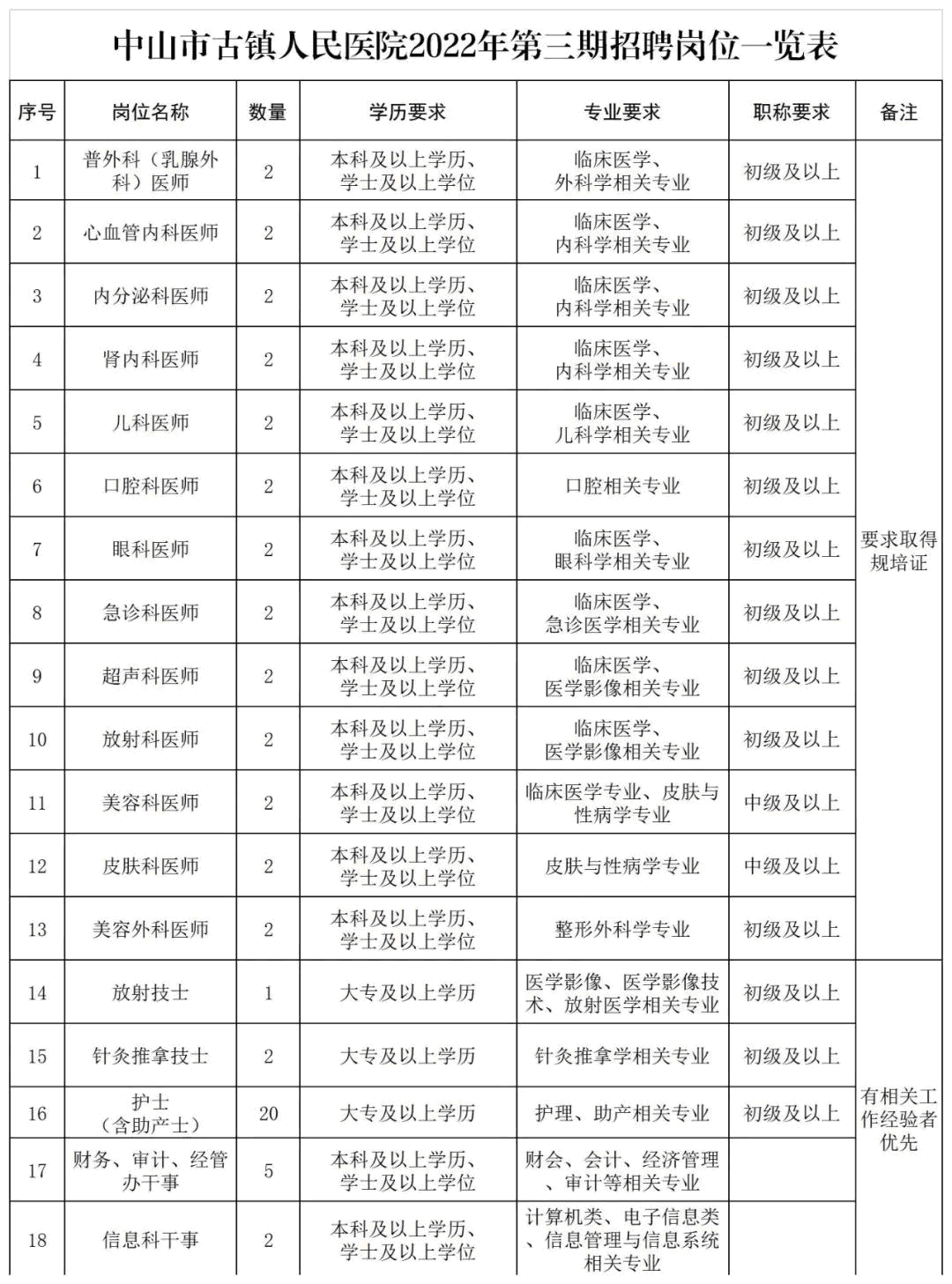 为进一步推动我院各项事业良好发展,我院面向社会招收一批高水平优秀医务工作者,根据医院工作需要择优录取。竭诚欢迎优秀人才前来应聘,加入古镇人民医院医院大家庭!让我们携手同行,守护生命!现将有关招聘事项公布如下: