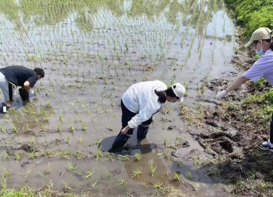 李林(中)在田间开展稻水象甲发生危害调查丨受访者供图