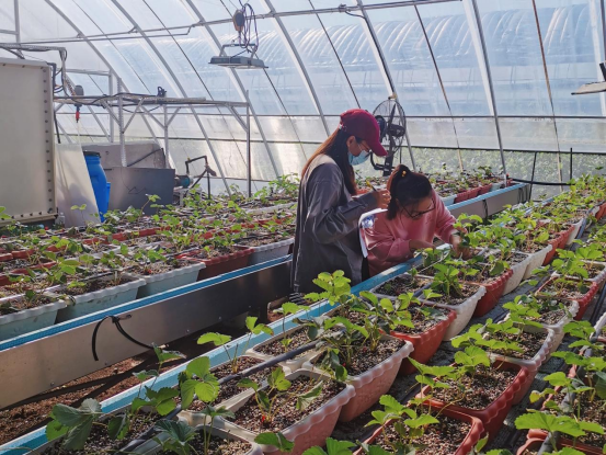 李林(右)在吉林省蔬菜花卉科学研究院进行草莓品种比较试验丨 受访者供图