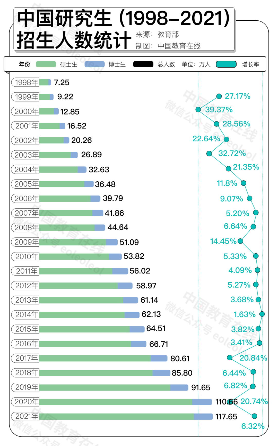 中国高等教育迅速迈过大众化,加速普及化,目前高校招生超过1000万人,研究生招生超过120万人,高校毕业生明年将高达1158万人。