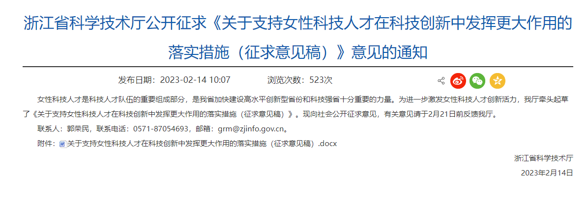 浙江省科学技术厅公开征求《关于支持女性科技人才在科技创新中发挥更大作用的落实措施(征求意见稿)》意见的通知