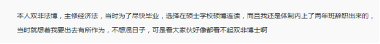 发帖人说,自己是双非法博,主修经济法,当时为了尽快毕业,选择在硕士学校硕博连读,而且还是体制内上了2年班再裸辞的,可到头来却发现好像很多人都看不起双非博士。