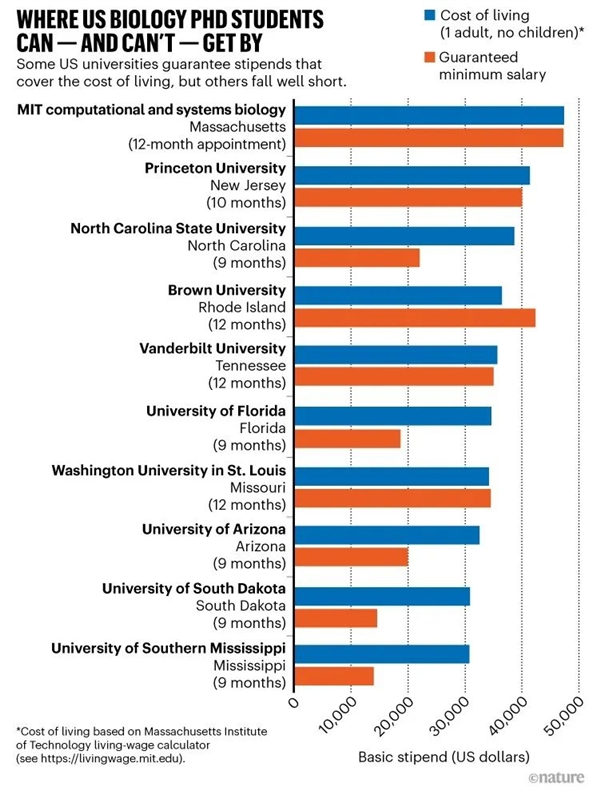 比如,在美国南部,博士生的收入比当地的基本生活工资平均低约8000美元。全美国的博士生与基本生活工资的平均短缺达4500美元以上。(注:基本生活工资,指用于估算给定城市的基本支出,例如食品、健康成本护理、住房和交通。)