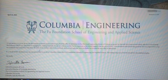 哥伦比亚大学工程与应用科学学院研究生招生办公室主任Gabrielle Gannon签署了这封决定书。校方同时会对学生预缴的学费进行全额退还。