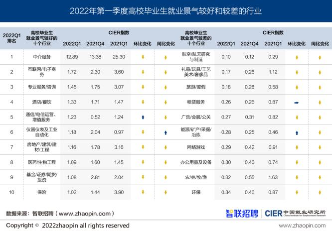 此前,智联招聘发布了《2022年一季度高校毕业生就业市场景气报告》,2022年第一季度高校毕业生CIER指数为0.71。从环比变动来看,招聘需求人数下降6%,求职申请人数上升16%,使得CIER指数环比下降0.17;从同比变动来看,招聘需求人数下降8%,求职申请人数上升75%,使得CIER指数出现同比下降0.63。