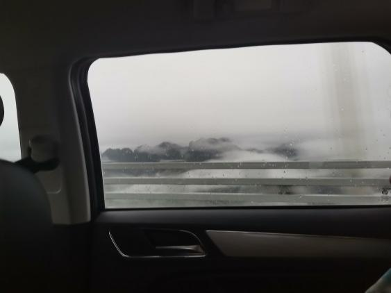 车行走在矮寨大桥上,云雾缭绕,原来三小时的路程缩短为一小时。
