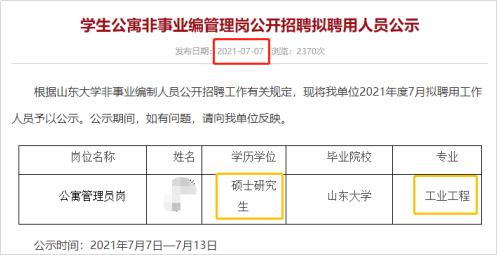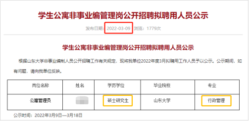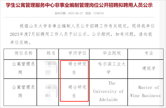 近日,山东大学学生公寓管理服务中心官网发布的一则公示引发热议。公示中显示,山东大学将聘用两名硕士毕业生为公寓管理员。这两名硕士,分别毕业于哈尔滨工业大学和澳大利亚阿德莱德大学,专业为建筑学和葡萄酒商务。