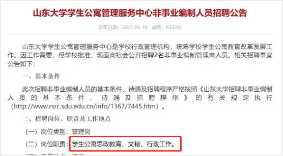 根据招聘公告显示,公寓管理员岗的岗位职责是“学生公寓思政教育、文秘、行政工作”,要求硕士及以上学历学位。