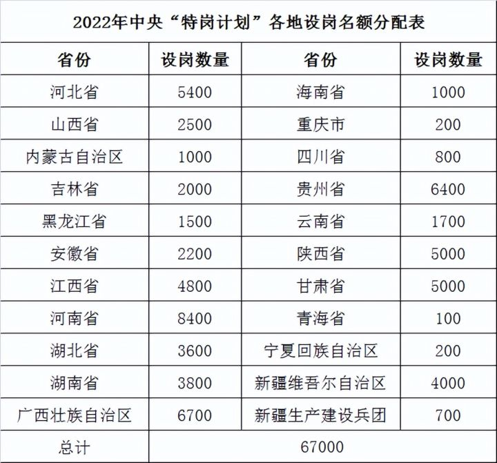 根据教育部办公厅、财政部办公厅近日联合印发的《关于做好2022年农村义务教育阶段学校教师特设岗位计划实施工作的通知》数据来看,全国计划2022年招聘特岗教师共计67000人,而2021年共招聘84330人,同比下降了20%左右。