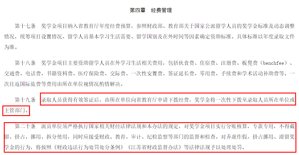 从政府官方文件《江苏省教育厅关于印发江苏政府留学奖学金项目管理办法的通知》来看:大学老师申请项目成功以后,所在高校就可以向省教育厅申请下拨经费,这笔钱会一次到达单位账户;大学老师拿到这笔钱后,则需要给提供一些留学期间相关的票据,一方面证明专款专用,同时也方便单位财务部门及时分账核算等工作。