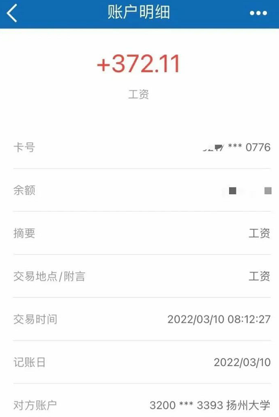 在知乎上发帖《高校教师工作5年月薪高达370》的作者“麦格纳”,是扬州大学的老师。2017年,她从清华博士毕业并入职扬州大学社会发展学院任教,平时研究中国古代史,在2022年3月美国访学哈佛大学期间查了查扬大的工资,发现仅有372.11元!