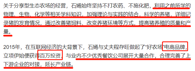 信息来源:《清华女博士石嫣:放弃高薪工作承包农场当农民,靠养猪年入800万》