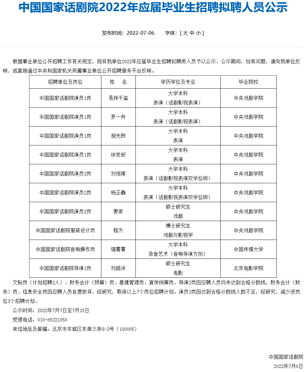△7月6日,中国国家话剧院公开2022年应届毕业生招聘拟聘人员名单,易烊千玺、罗一舟、胡先煦等名字在列