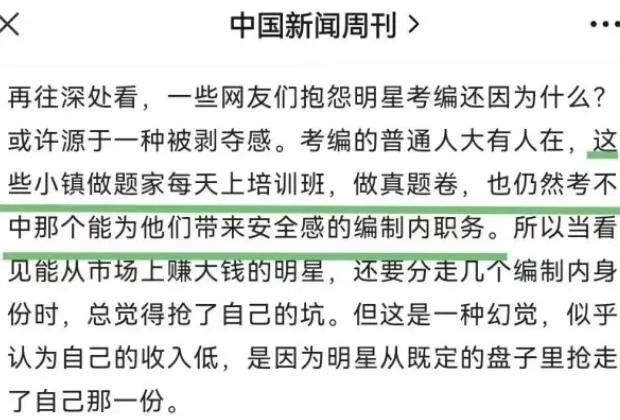 在「一编难求」的今天,舆论发酵得越来越高涨,对此《中国新闻周刊》发文,称以上质疑是“小镇做题家看见能从市场上赚大钱的明星,还要分走几个编制内身份时,总觉得抢了自己的坑”的心态。