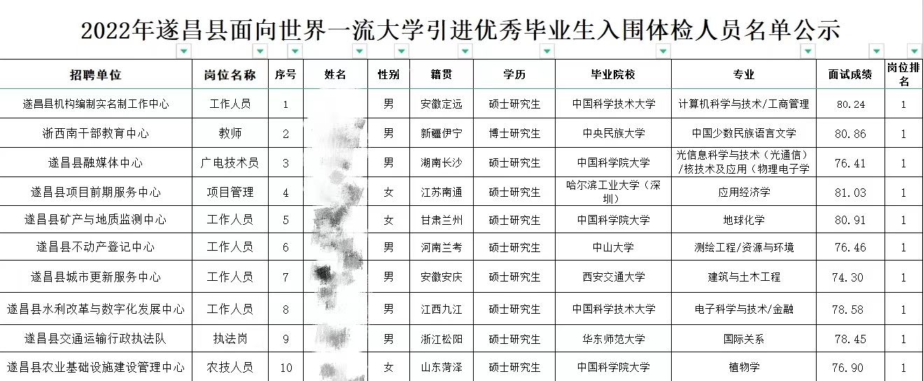 一份2022年遂昌县引进人才入围体检人员名单显示,24个基层岗位吸引了4名博士和19名硕士,其中不乏上交、复旦、浙大这样的985名校。