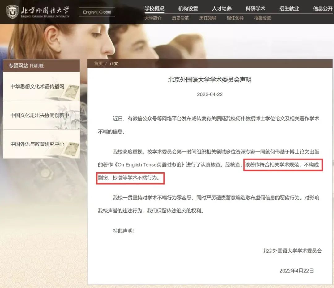 第二起事件是,4月22日,北京外国语大学学术委员会发布声明,认定该校何伟教授的著作《On English Tense英语时态论》“符合相关学术规范,不构成剽窃、抄袭等学术不端行为”。