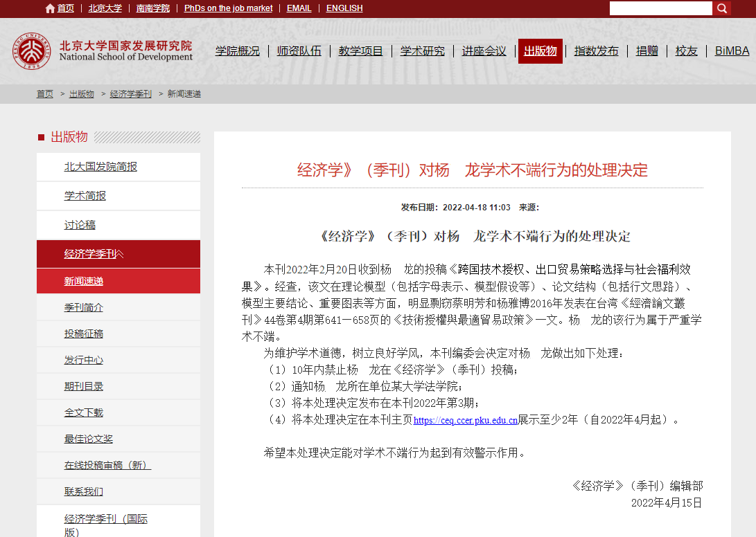 在其官网“北京大学国家发展研究院”(https://ceq.ccer.pku.edu.cn/xwsd/522366.htm)上,《经济学》编辑部发布一则处理决定。