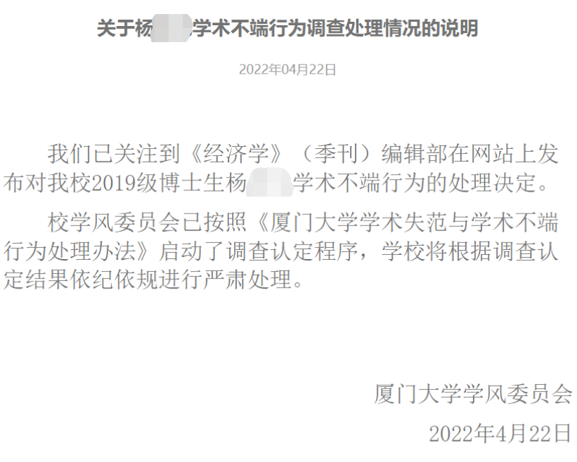 对此,厦门大学学风委员会也随即发布情况说明,宣称该校已经启动调查认定程序,将作出相应处理。