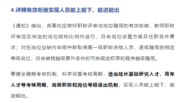 湖北省2021年底出台《关于进一步深化我省高等学校教师职称制度改革的通知》,其中明确要求,“要健全聘期考核机制,科学设置考核周期,适当延长基础研究人才、青年人才等考核周期,完善职称和岗位等级退出机制,实现人员能上能下、能进能出。”