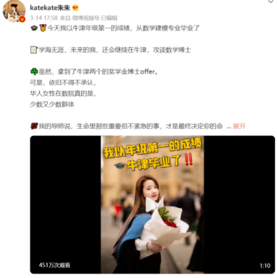 事情起源为博主朱朱庆祝自己毕业,在微博写道:“今天我以牛津年级第一的成绩,从数学建模专业毕业了。学海无涯,未来的我,还会继续在牛津攻读数学博士。虽然拿到了牛津两个奖学金博士offer,可是不得不承认,华人女性在数院真的是少数又少数的群体。”