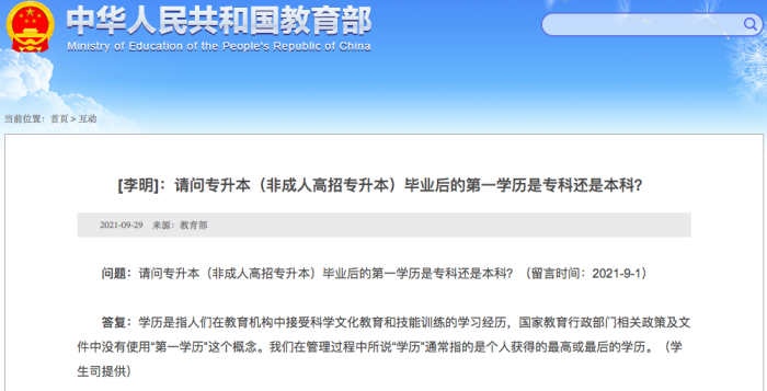 在2021年9月,针对网友提问“专升本(非成人高招专升本)毕业后的第一学历是专科还是本科”,教育部曾公开回复称,国家教育行政部门相关政策及文件中没有使用“第一学历”这个概念。我们在管理过程中所说“学历”通常指的是个人获得的最高或最后的学历。