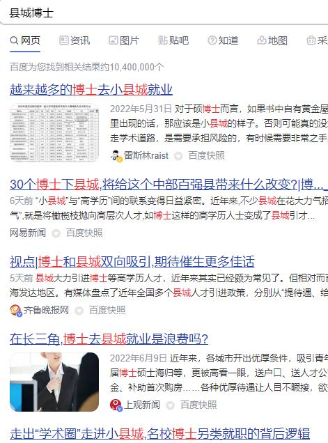 在供应量大幅增加以及就业压力的双重作用下,一些县城有了更多的机会去招揽高学历人才。打开搜索引擎,打出“县城博士”四个字,相关的搜索结果就有1040万个。