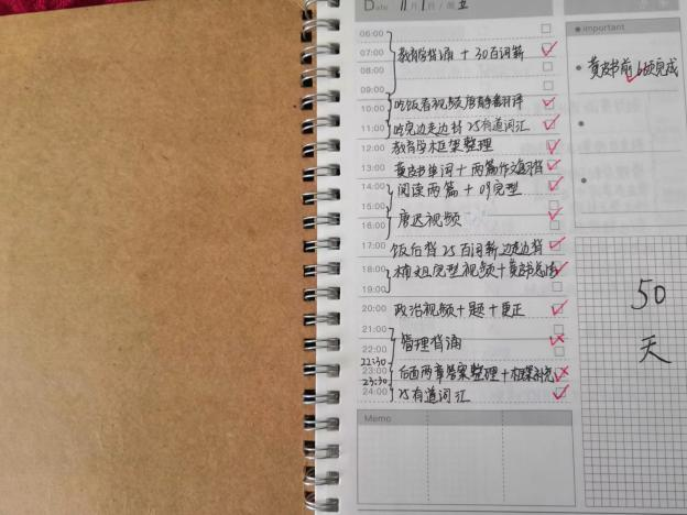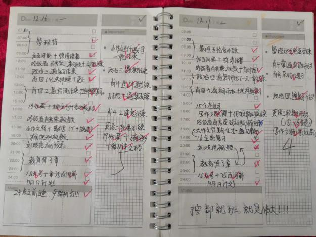 关于时间管理,我认为是非常重要的。我备考时间很短,不到两个月,但结果却出乎我的意料。能考到360分左右,就很不错了,出成绩那天,却高出估分将近30分。这一切都要归功于“每日计划本”。