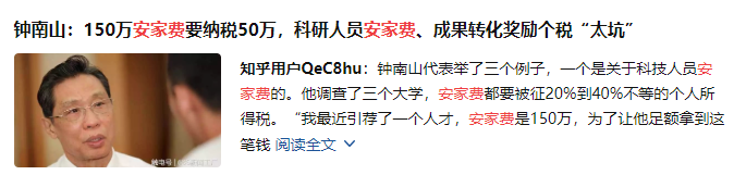 钟南山院士接受采访道:“我最得意的一个学生,拼命干,除了当医生以外所有时间做研究,取得很好成绩。医院今年初奖了他22万,很高兴。但(广州市)越秀区财局说你这个不行,要放在工资里一块算,就得交40%的税。这还不算,说你前年也得过奖励,还要补交。最后这位科研人员拿到手的就只有11万,他很泄气。”