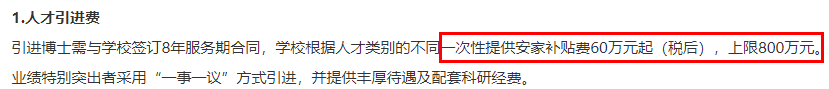 “人事处说,「一百万安家费学校不打折,都是给引进人才的」。”