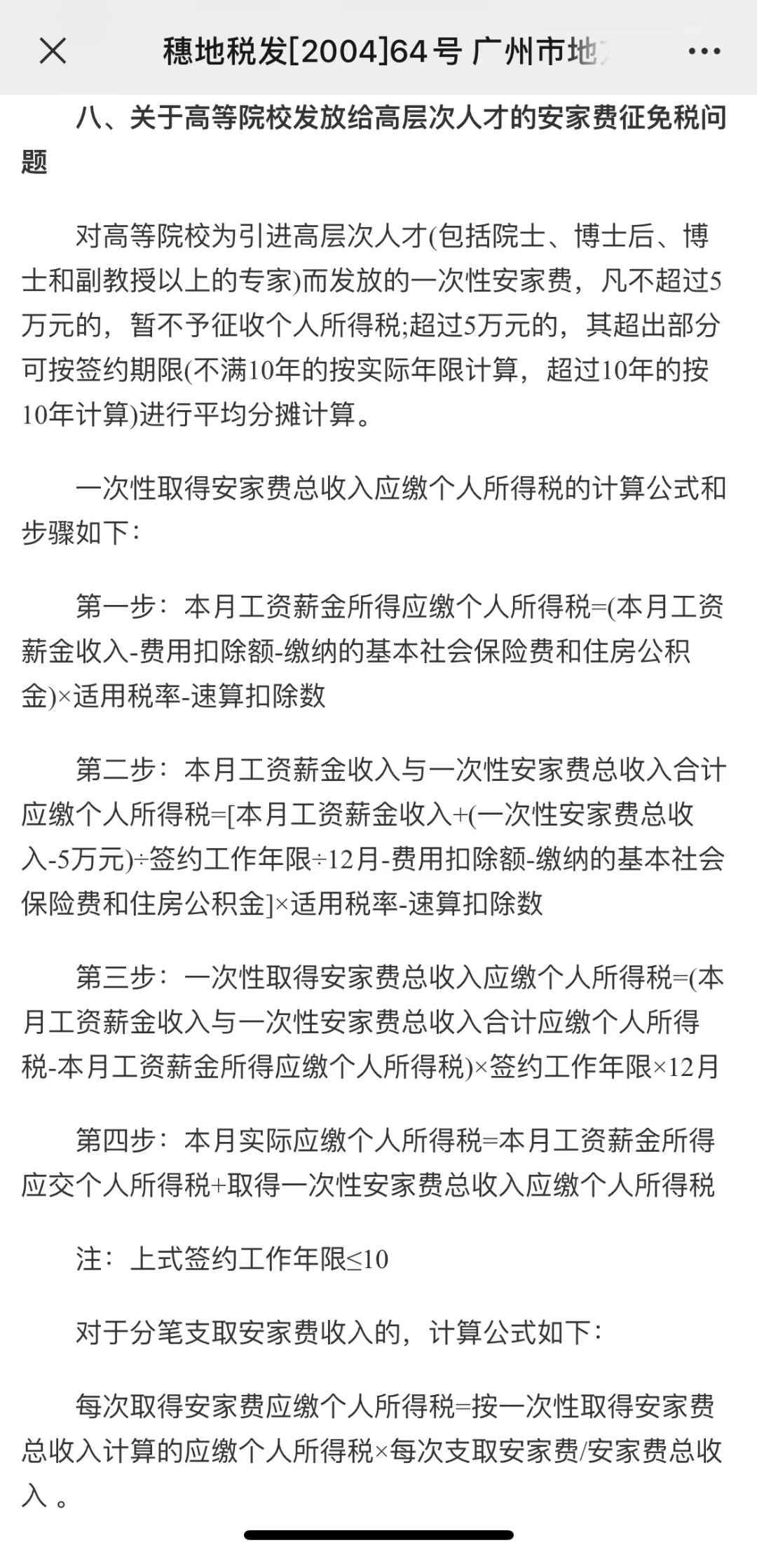 比如广东地区,可以参考《广州市地方税务局关于个人所得税若干业务问题的通知》(穗地税发[2004]64号)第八条关于高等院校发放给高层次人才的安家费征免税问题规定。(见下图)