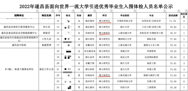 这番解释与上述公示名单相吻合。记者看到,24名一流高校的优秀毕业生中,除7位硕博士生(6位硕士、1位博士)将入职乡(镇)、街道下属事业单位外,其余17位的工作岗位均须具备一定的相关专业技能。例如,遂昌县食品药品安全检验检测中心招聘的是检验员岗位,对应的待入职的张博士,是上海交通大学有机化学/生物医学工程专业毕业生。