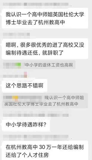 不少博士认为杭州的某些公办高校待遇太低,纷纷转换赛道。比如,杭州的公立高中的年薪可以达到30万,如果是博士的话,人才引进即落实编制。而杭州市招聘在职在编公办教师的要求,仍然是硕士可报,甚至本科也行。