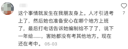 同样是承诺给编制的岗位,有的单位落实编制几个月到一年以上不等,甚至试用期已过,仍在和人才“画饼”。有的事业单位,招考时承诺“有编制”,等你考上了,又说“编制没位置,来的话要等明年。”